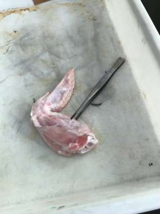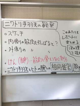 2年理科、解剖シリーズ第3弾はニワトリの手羽先です。筋肉の収縮と骨格の運動の関係について、ピンセットで手羽先の筋肉を引っ張って確認しました。ニワトリの翼とヒトの腕との進化の関係についても学びました。
