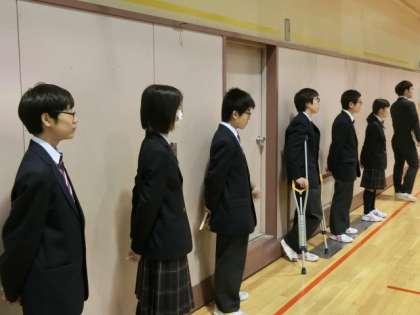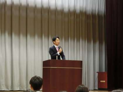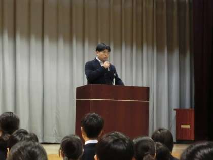 全校朝会で、校長先生から言葉の力についての話、安全担当からSNSとの適切な付き合い方についての話、生活指導主任から行事の成功を学校生活に生かすことの話がありました。