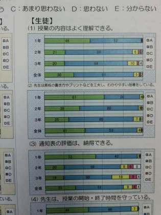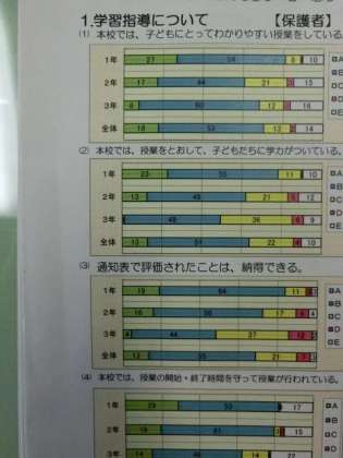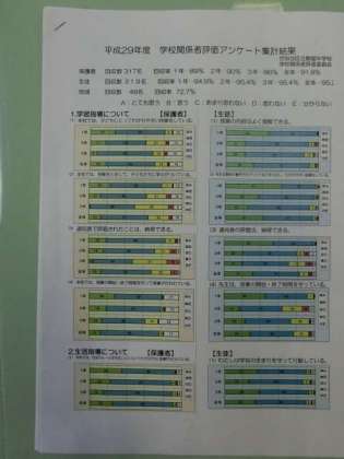 皆様にご協力いただきました。『学校関係者評価アンケー』トの集計が終了しました。おかげさまで本年は回収率がアップいたしました。良好な評価も多くいただき、ありがとうございます。項目ごとに『とても思う』『そう思う』との回答を合計した%の上位は、生徒では、「授業内容は理解できる」「先生はわかりやすい指導をしている」「私は決まりを守っている」がそれぞれ90%を超えました。保護者では、「子どもは学校行事を楽しみにしている」「学校生活が楽しいと感じている」「学校に活気がある」「校長はリーダーシップを発揮している」などが、90%を超えました。この後、学校評価委員に結果を送付して分析をお願いし、評価報告書や次年度への提言を作成していただき、その結果を次年度の学校経営計画にいかしていきます。最終報告は2月ごろを予定しています。