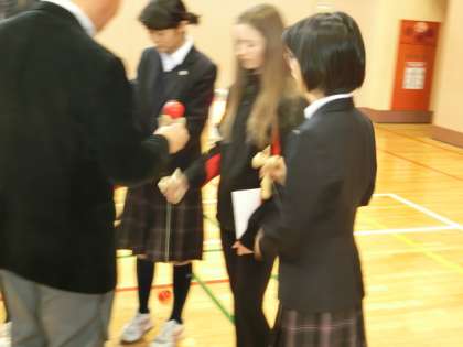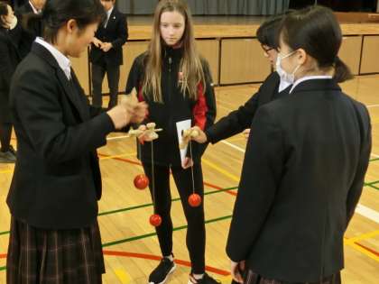 歓迎の意味を込めて、2年生は日本の遊び紹介をしました。フルーツバスケット・コマ回し・けん玉をしました。