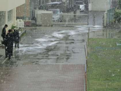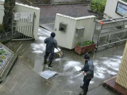 明日の積雪に備えて、主事さんが、凍結防止剤をまきました。