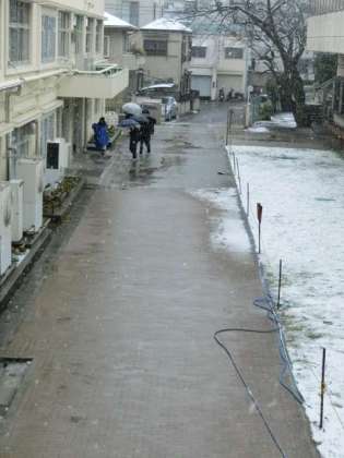 凍結防止剤と朝の除雪で、登校に積雪の影響はありませんでした。