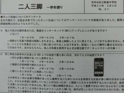 本校の生徒会が、「ネット社会について」のアンケートを行った集計がまとまりました。『自分や他人の顔写真や動画をインターネットやSNSにアップしたことがありますか?』の質問に「はい」と回答した生徒は、1年生85% 2年生63% 3年生67%です。一度載せた画像や動画は削除できません。全く知らない人が、悪用したり、犯罪の被害者にもなりかねませんので、注意しましょう。とても怖いことです。一学年だよりにも詳しく出ています。