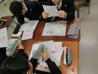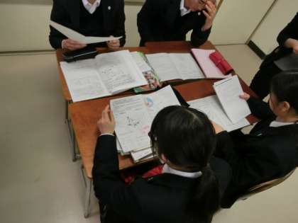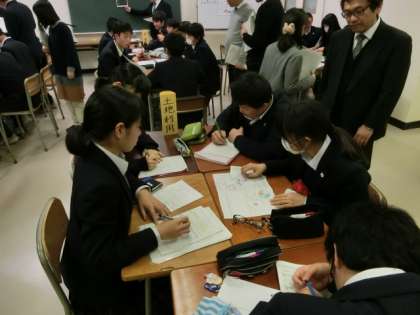 グループの規模や種類を変えながら、生徒同士が学びあったり、様々な考えを深めていき、パズルのように学習していく「ジグソー型」の授業形態に取り組みました。生徒達は、主体的に良く取り組み発言も活発に行っていました。