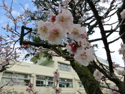 池のほとりのアンズが満開を迎えています。
