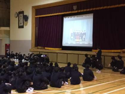 生徒会主催の新入生歓迎会がありました。部活動紹介では各部2分以内で、さまざまなPRをしました。