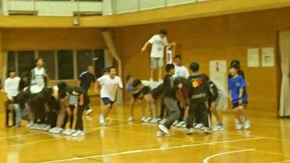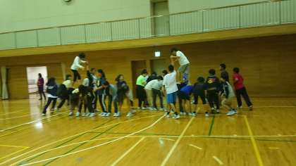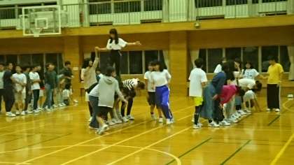 レクリエーションが始まりました。昨日に引き続き、運動会練習「いかだ流し」。