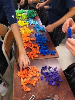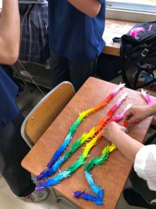 三年生が総出で作った千羽鶴を、実行委員が糸で束ねています。広島平和祈念公園で、平和を願い捧げます。