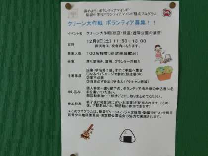 12月8日(土)土曜授業の後、恒例の「クリーン大作戦」を行います。ボランテイアを募集します。各クラスにも掲示しましたが、渡り廊下のボランテイア黒板にも掲示しました。部活動での参加は、顧問の先生から、人数を聞いています。個人で参加してくれる人は、19日(月)までに、申込書に名前を記入してください。