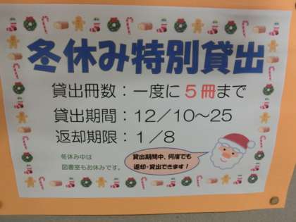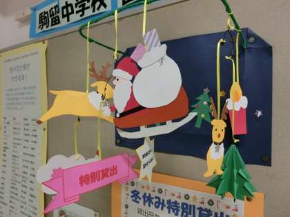 校長室前の図書館掲示板にクリスマスモールと、冬休みの貸し出しのお知らせがあります。新しい本も色々入っています。冬休みに借りて、読んでください。