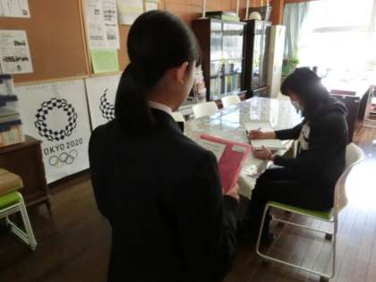 今朝から、都立高推薦入試の出願に行ってきた3年生が、戻って受験番号を先生に報告しています。26日27日が受検日です。