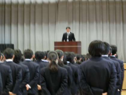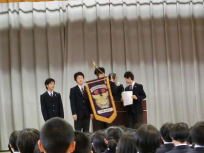 今年度最後の全校朝会。防災標語コンクールと卓球部の表彰もありました。防災標語は、「備えれば 助かる命が きっとある」1年教室と廊下、階段と2階の応接室前にのぼりが貼ってあります。学校にいらした時ご覧ください。