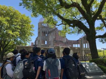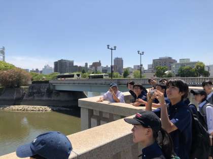 ボランティアガイド(地元大学生や元高校教員の方々)の説明による班行動です。真剣に話を聞きながら回っています。