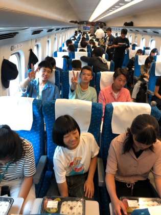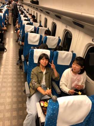 新幹線車内で、仕出しのお弁当を食べています。この後、京都駅から東山方面へ班行動開始です。