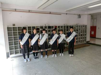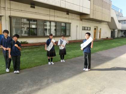 9/9(月)〜12(木)まで、生徒の登校時刻に合わせて生徒会役員選挙の立候補者たちが選挙運動を行っています。(9/9(月)は台風上陸により中止)13(金)6校時の立会演説会に向けて、それぞれの立候補者たちのアピールは続きます。