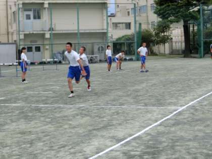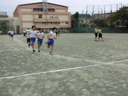朝から涼しい一日でした。区陸上競技大会の朝練習は、文字通り開始時刻に練習が始められるよう、代表生徒は早めに集合し自ら会場準備をしています。写真は男子1500m、男子4×100mリレー、女子4×100mリレーの様子です。