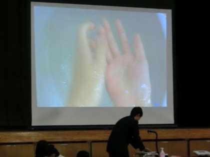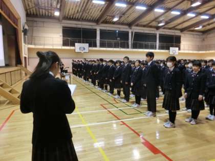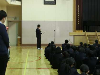 12/16(月)生徒朝会を行いました。生徒会からは、生徒会長の説明後に駒留ルネサンス(合唱コンクール)の様子をコンパクトにまとめたビデオを鑑賞しました。編集やBGMの選曲も生徒会役員の手によるものです。続いて、保健衛生委員会は、正しいマスクの着用方法、手洗いの仕方を劇の中で示しました。プロジェクターで実演を投影するなど、工夫が凝らされていました。最後は、図書委員会から冬休みに向けた本の貸し出しについての説明です。生徒による生徒のための朝会、を実感する朝の時間でした。