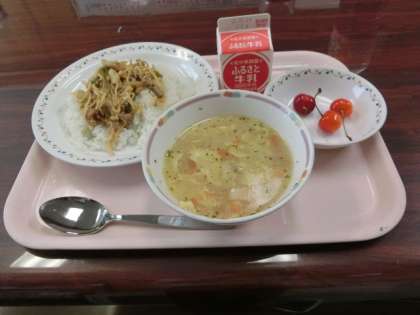 7月2日の給食のメニューは「チンジャオロース丼、卵とトマトのスープ、くだもの(さくらんぼ)、牛乳」です。