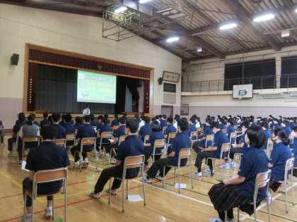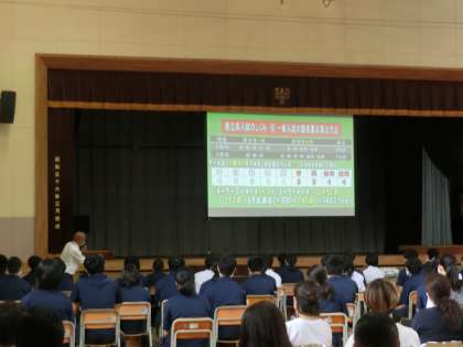 本日は、第1回進路説明会がありました。進路指導主任から学校選びのポイントや推薦入試・一般入試の内容について話がありました。希望する進路の実現に向けて、高校の情報を集めたり、学習の苦手を克服したりと準備を進めていきましょう。