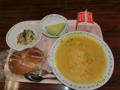 7月15日の給食のメニューは「胚芽パン、パンプキンシチュー、ビーンズサラダ、くだもの(メロン)、牛乳」です。