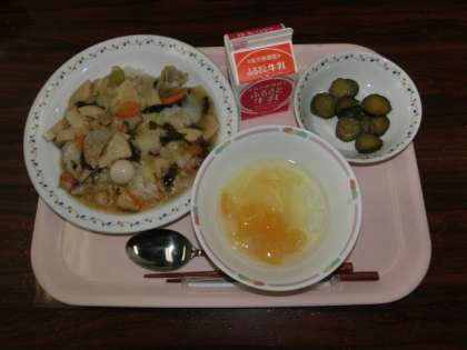 7月20日の給食のメニューは「中華丼、きゅうりのピリ辛和え、フルーツポンチ、牛乳」です。
