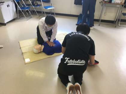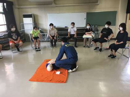 22日、AEDを使った心肺蘇生法の校内研修会を行いました。世田谷消防署三宿出張所の職員を講師に、万が一の場合に備えて真剣に研修に臨みました。