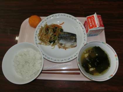 9月3日の給食のメニューは「麦入りごはん、さばのみそ煮、野菜のごま酢和え、すまし汁、冷凍ミカン、牛乳」です。