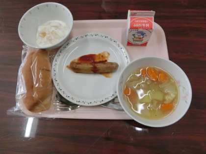 10月2日の給食のメニューは「ホットドッグ、ポトフ、フルーツヨーグルトがけ、牛乳」です。