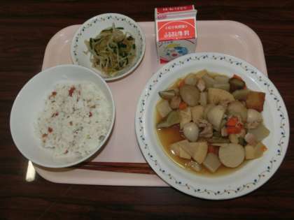 10月5日の給食のメニューは「梅じゃこごはん、鶏肉と里芋のうま煮、もやしとにらのごま風味、牛乳」です。