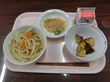 10月8日の給食のメニューは「煮こみうどん、大学芋、春雨サラダ、牛乳」です。