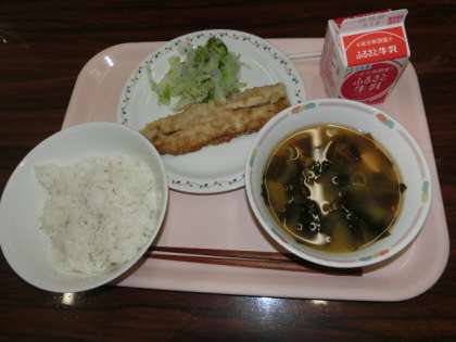 10月14日の給食のメニューは「麦入りごはん、みそ汁、さんまのかば焼き、ゆかり和え、牛乳」です。