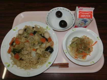10月15日の給食のメニューは「五目あんかけ焼きそば、大根とじゃこのカリカリサラダ、ぶどう、牛乳」です。