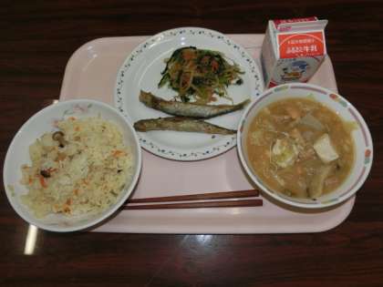 10月19日の給食のメニューは「きのこごはん、石狩汁、ししゃものから揚げ、ごま和え、牛乳」です。