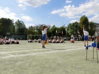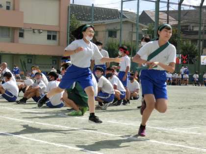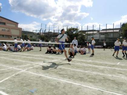 女子の競技を締めくくる3年代表生徒による走り。抜きつ抜かれつの展開となりました。順位は、1位緑色4組、2位青色2組、3位赤色1組、4位黄色3組でした。