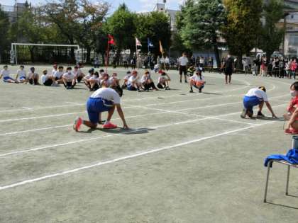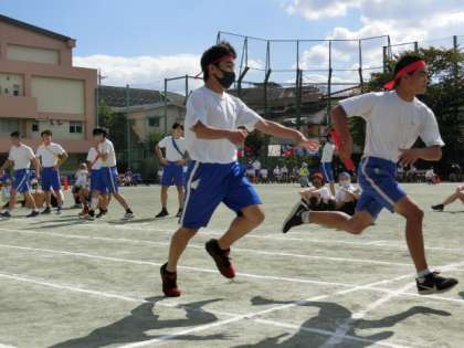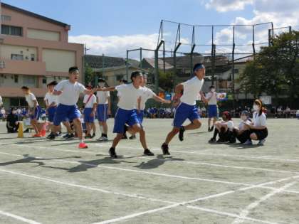 大トリは3年男子代表生徒によるリレーです。力強さとスピード、圧巻の走りでした。順位は、1位赤色1組、2位青色2組、3位緑色4組、4位黄色3組でした。なお、1組のタイムは歴代の記録を更新しました。おめでとう!