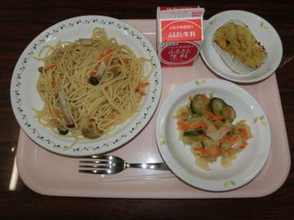10月27日の給食のメニューは「きのこスパゲッティ、野菜のイタリアンドレッシング和え、スイートポテト、牛乳」です。