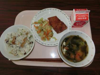 11月2日の給食のメニューは「まめまめおこわ、いかのから揚げ、野菜のレモン醤油和え、みそ汁、牛乳」です。