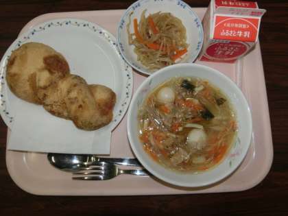 11月6日の給食のメニューは「きなこ揚げパン、春雨スープ、もやしのごま風味、牛乳」です。