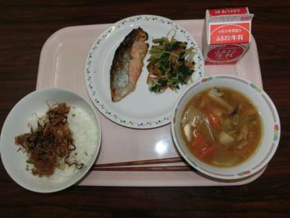 11月9日の給食のメニューは「ごはん、カミカミ佃煮、鮭の塩麹焼き、お浸し、豚汁、牛乳」です。