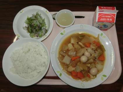 11月12日の給食のメニューは「麦ごはん、豚肉と大根のうま煮、ゆかり和え、りんごゼリー、牛乳」です。