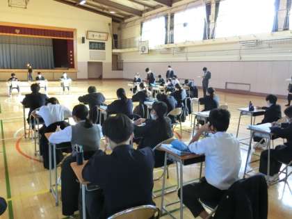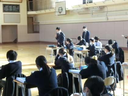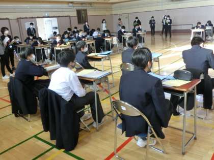 他校からも多くの先生が参加するため、密を避け体育館で授業を行いました。賛成派、反対派ともにしっかりとした意見発表ができました。