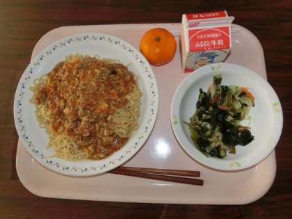 12月11日の給食のメニューは「ジャージャー麺、海藻サラダ、みかん、牛乳」です。
