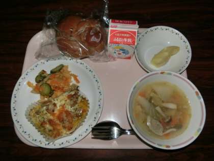 12月14日の給食のメニューは「ココアパン、田舎風豆スープ、白身魚のマヨネーズ焼き、イタリアンサラダ、りんご、牛乳」です。