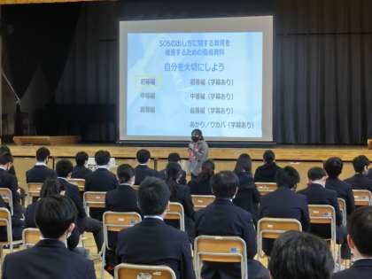 本日の5時間目に2年生がSOSの出し方講習を行いました。ストレスをためこんで、心身が疲れているとき、どのように助けを求めるか、また助けてあげられるかという内容をDVDを見て学びました。