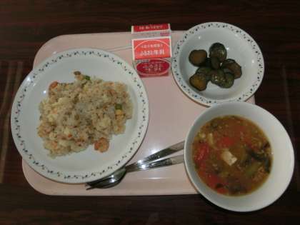 2月5日の給食のメニューは「チャーハン、きゅうりの中華味、麻婆汁、牛乳」です。