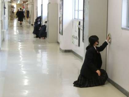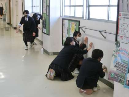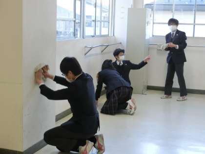 本日の放課後、1・2年生の整美委員会とボランティアの生徒が廊下の壁の清掃を行いました。受験生である3年生の廊下の壁を、1・2年生が一生懸命磨く姿が見られました。