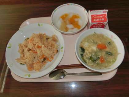 3月3日の給食のメニューは「かにちらし寿司、かきたま汁、フルーツ入り杏仁豆腐、牛乳」です。
