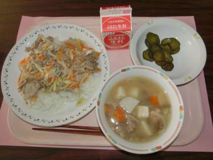 3月5日の給食のメニューは「ねぎ塩豚丼、きゅうりのピリ辛あえ、みそけんちん汁、牛乳」です。