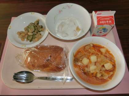 3月11日の給食のメニューは「ダイスチーズパン、ビゴス、ビーンズサラダ、フルーツヨーグルト、牛乳」です。