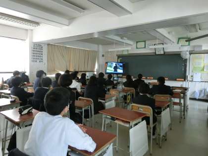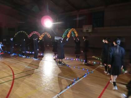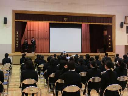 本日、6校時に3年生を送る会がありました。1・2年生が作成した思い出ビデオが上映され、感謝の言葉が送られました。生徒会からは、3年間を振り返った写真のスライドショーが上映されました。最後に、3年生からお礼の言葉が送られました。感染症対策として、全校生徒が体育館に会することはできませんでしたが、Zoom配信を行い1・2年全員が卒業を真近に控えた3年生をお祝いすることができました。